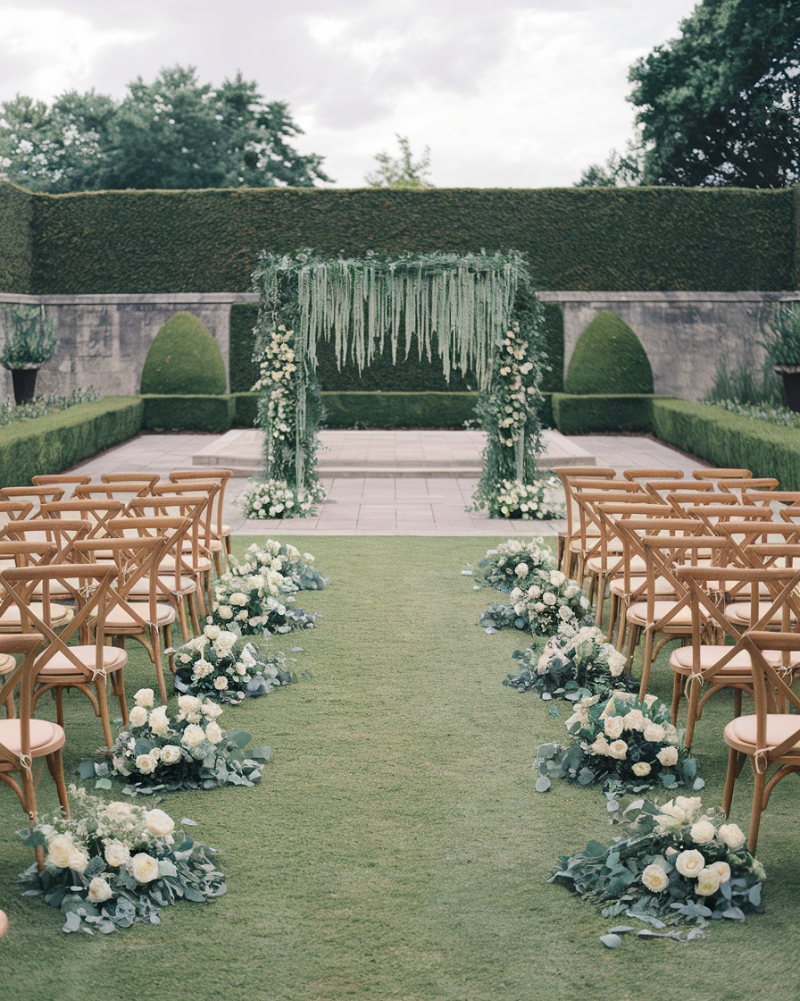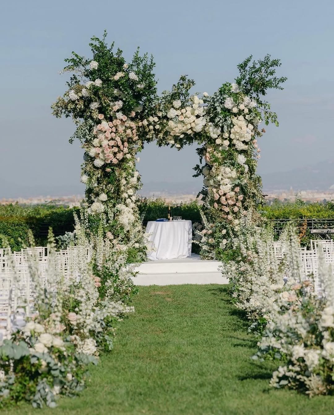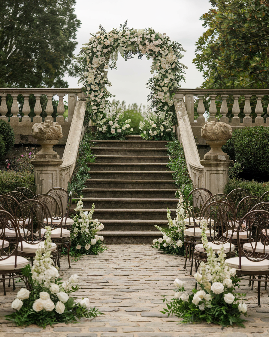 Framed by sweeping stone stairs and a dramatic balustrade, this floral arch drips with creamy white roses and wild greenery in the most enchanting way. The wrought iron chairs give it a bit of European flair — like you’re about to watch someone say “I do” at a 19th-century villa in the hills of Provence.