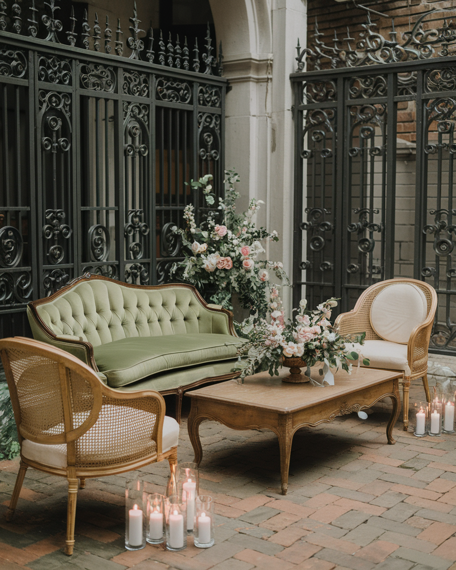 The tufted sage velvet sofa instantly sets a romantic, old-world tone — it feels like something you’d stumble upon in a Jane Austen novel (but with better lighting and more champagne). Paired with vintage cane chairs, blush florals, and glowing votives scattered across the brick, it’s giving moody garden soirée meets French parlor.