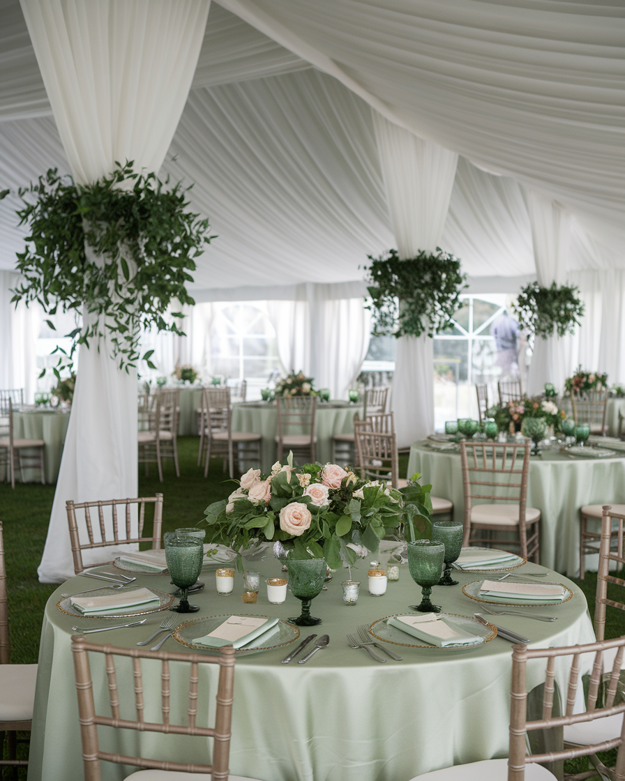 Sage green linens, vintage-inspired green glassware, and blush blooms feel effortlessly elegant — like the garden decided to dress up. I love how the hanging greenery adds a sense of height and softness, without overpowering.