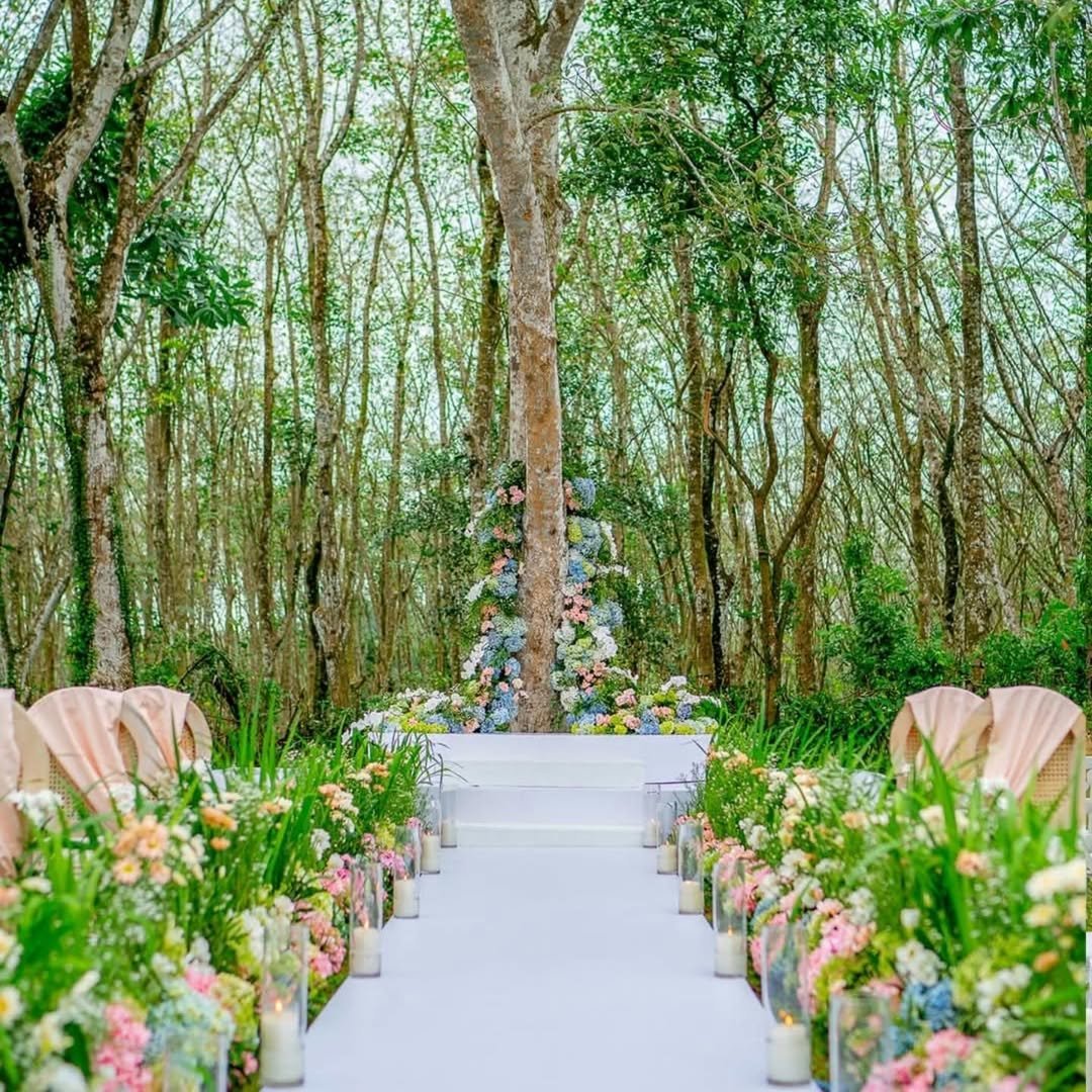 @nationaldecorators turned an open-air space into a green-draped sanctuary — complete with wild grasses, dreamy florals, and a canopy dripping in vines and chandeliers. I love how the mirrored aisle reflects all that organic beauty upward, making you feel like you’re walking through a living painting.