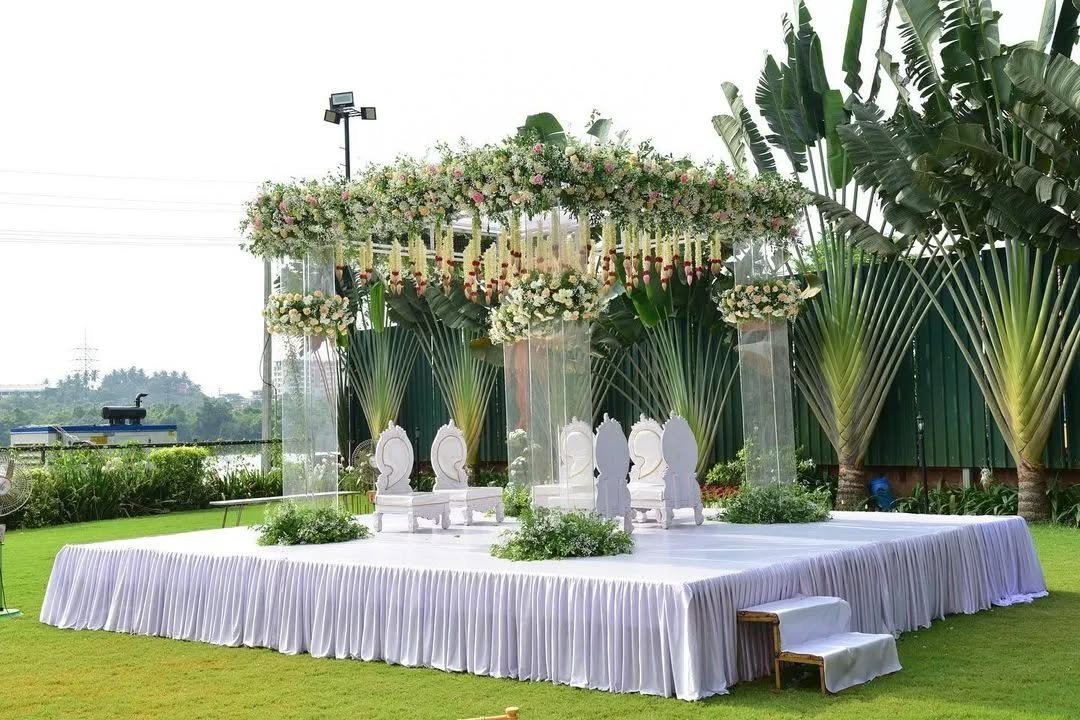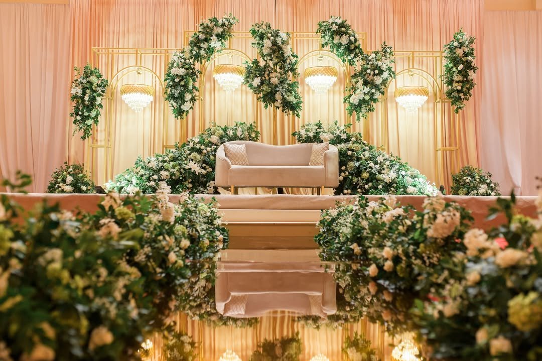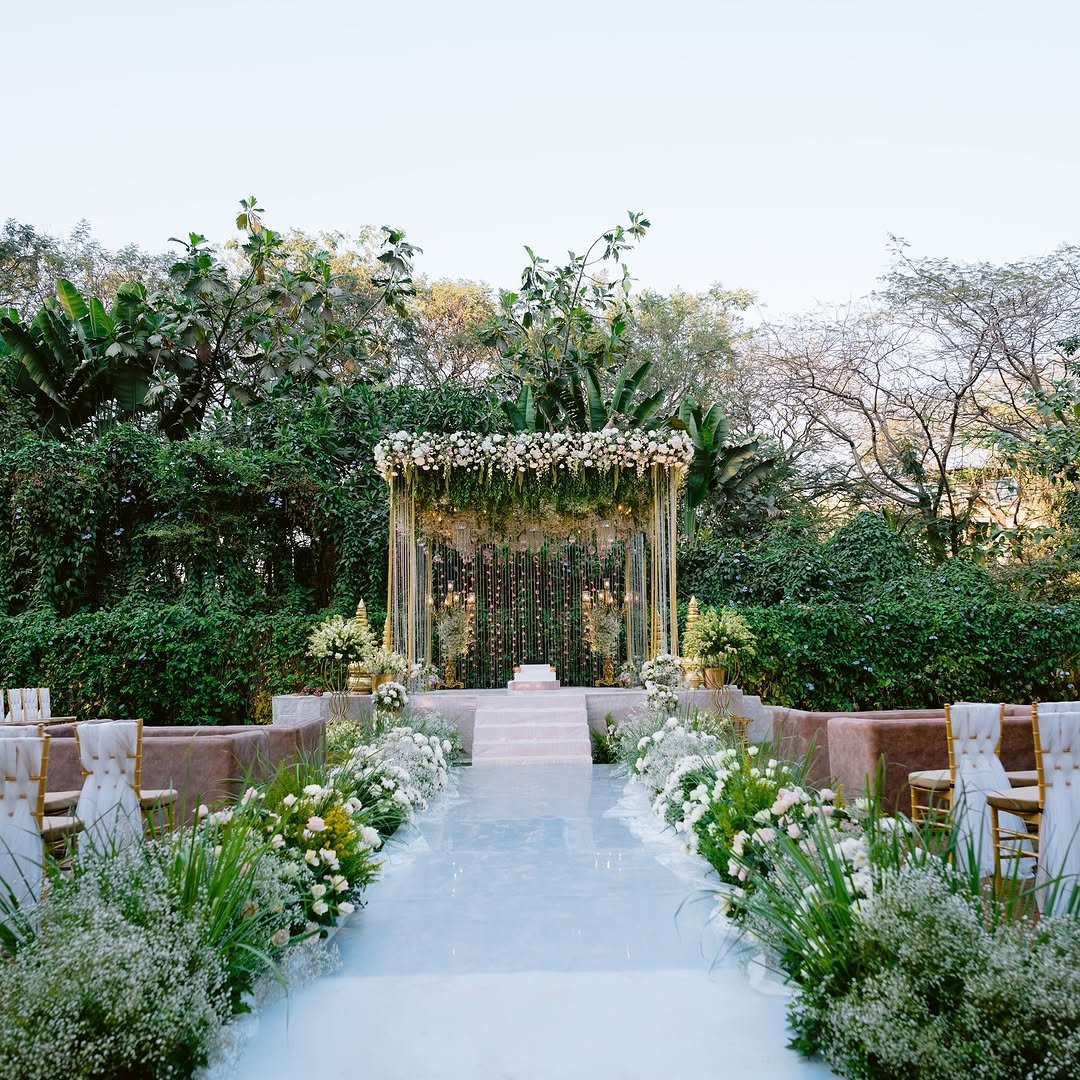 @decordiyaa created something so magical with this elevated white stage and crystal-clear pillars. It almost feels like the florals are hovering above the ceremony space, cascading like a waterfall of petals and light. And those perfectly fanned palms behind it all? Mother Nature’s way of saying, you’re welcome.