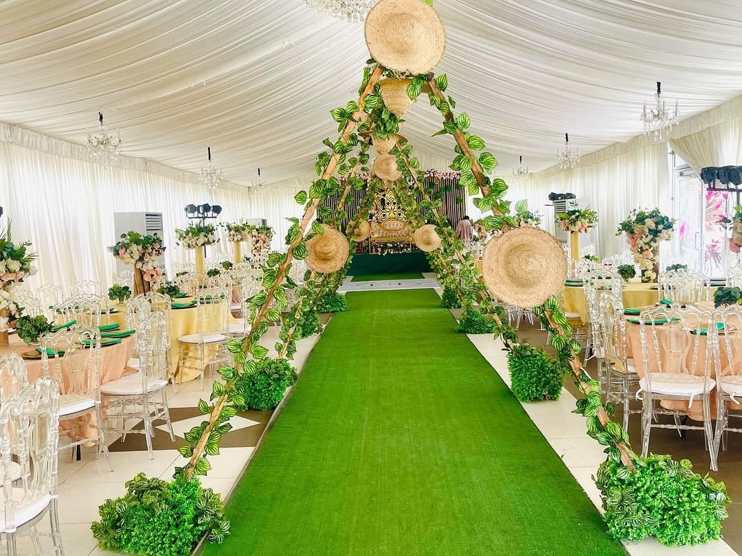 @regiusdynastyevents brought so much personality to this setup, from the bright green aisle that felt like a runway of fresh grass, to the vine-wrapped arches decked out in woven hats. It’s playful, textured, and totally different — and I’m obsessed with how the ghost chairs and soft blooms kept it feeling polished.