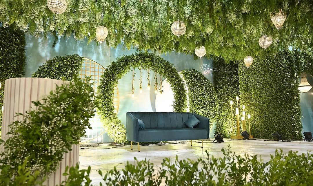 Signature Events (@signature_events_kerala) created this unbelievably lush backdrop using layers of greenery — from the curved hedges to that cascading ceiling canopy. The orb chandeliers felt like fireflies caught mid-twirl, and the modern teal seating grounded it all with a bold, editorial edge.