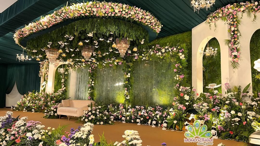 Muhurtham Wedding Planner (@muhurthamweddingplanner) completely transformed the space with walls of green, layered florals, and chandeliers cascading from a canopy of hanging vines. I couldn’t stop staring at the floating birds — they added this little surreal, storybook twist I didn’t know I needed.