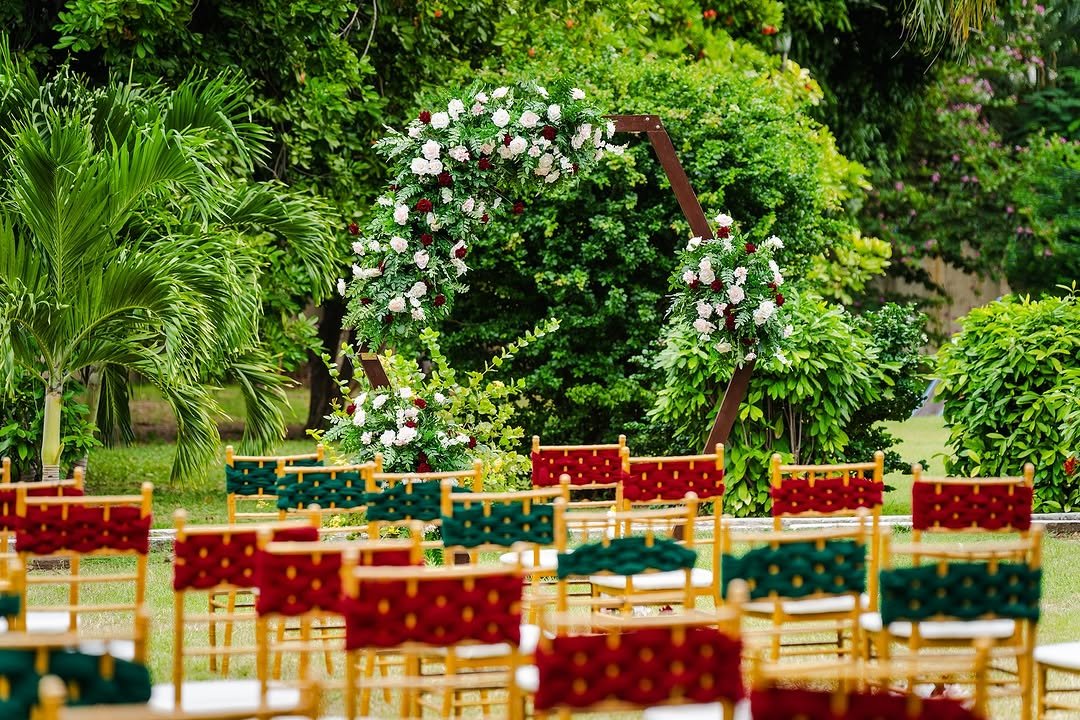 I’m obsessed with how DIVINE EVENTS played with contrast here — emerald and ruby tones on the chairs, soft blush and burgundy blooms on the hexagon arch, and that lush garden backdrop holding it all together. It felt regal, relaxed, and deeply personal in the best way.