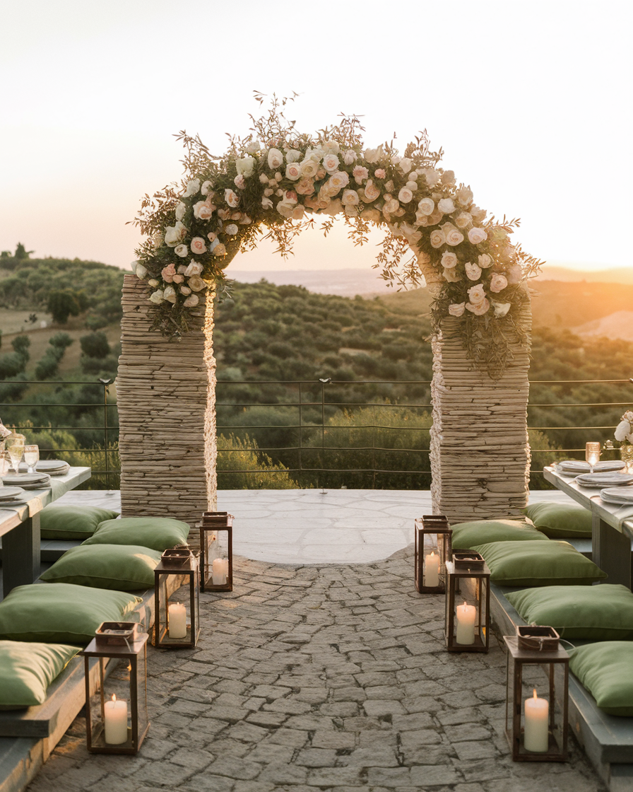 This scene is everything I love about understated romance — a soft floral arch perched between stacked stone columns, sunset glowing through the olive trees, and green cushions that say “yes, we’re lounging, but make it chic.” I’m obsessed with how the whole space feels grounded but elevated — like a rustic Italian postcard with perfect posture.