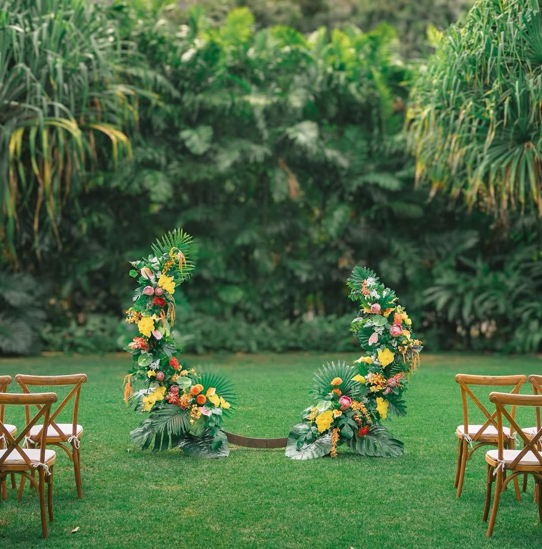 Bright tropical blooms curved into the dreamiest crescent shape, with palms and monstera leaves giving it that lush, island energy I live for. It felt playful without being chaotic, sculptural without trying too hard. And honestly? It was pure @weddingsofhawaii magic — they have a way of letting nature feel like the guest of honor.