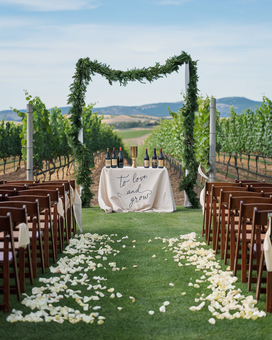 This scene is everything — soft petals scattered down a green lawn, folding chairs that feel rustic but refined, and that garland-draped arch just casually framing the hills like it was born for the moment. The wine table (yes, plural bottles) made me laugh a little — to love and grow… and sip, obviously.
