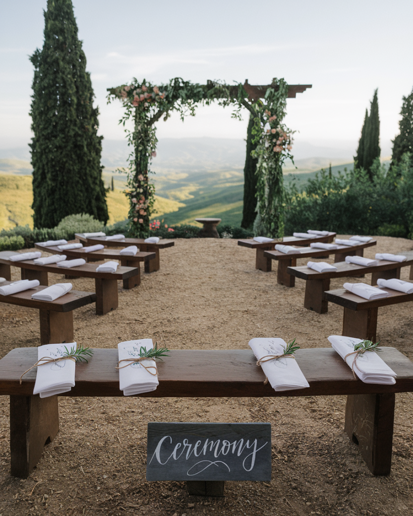 There’s something endlessly romantic about this tucked-away hillside ceremony — maybe it’s the golden light rolling across the valleys, maybe it’s the sweet simplicity of rosemary-tied napkins on rustic benches (hello, chic and fragrant!). The floral-draped arch feels like a gentle nod to old-world Italian gardens, while the earthy tones underfoot ground everything in cozy elegance.