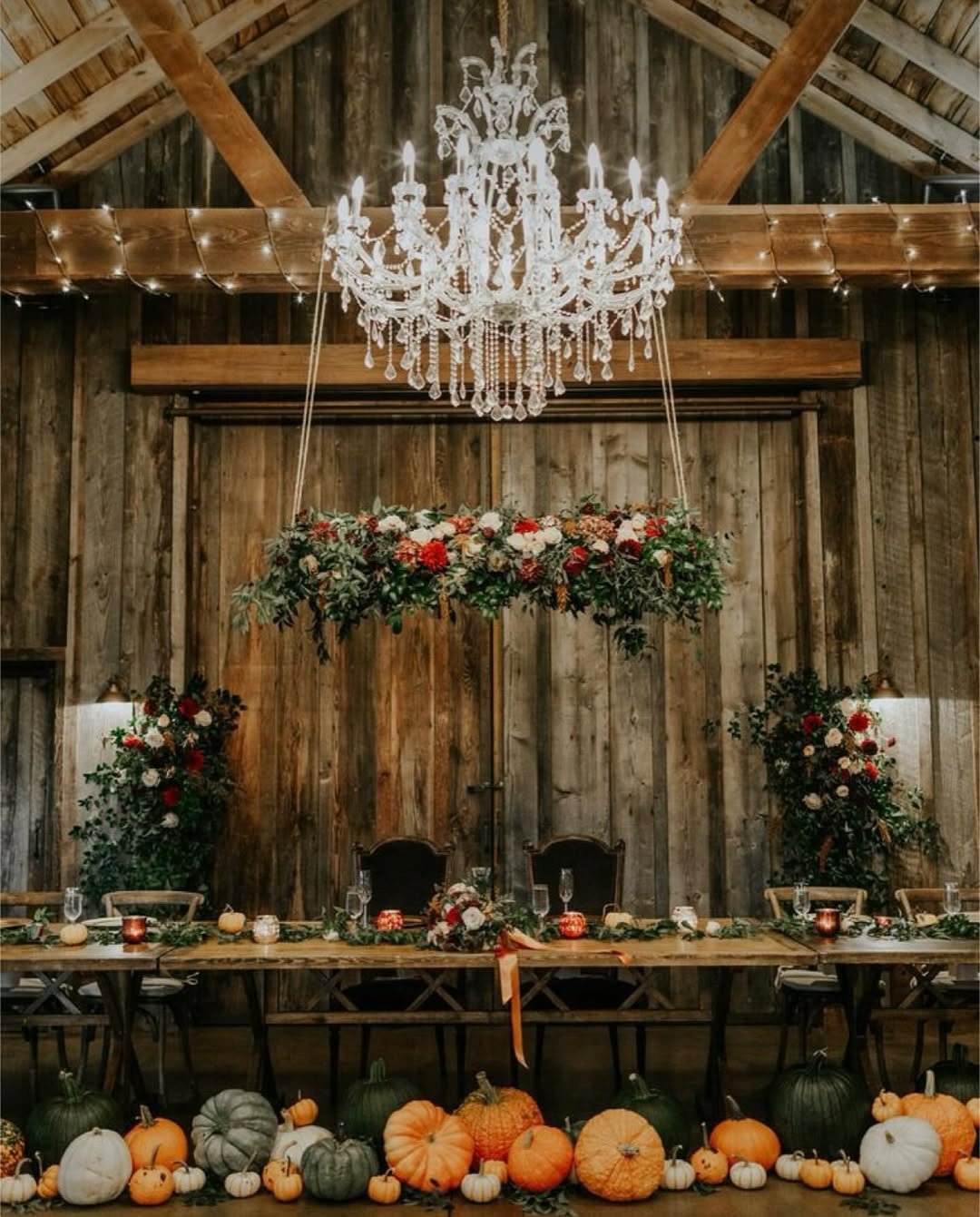 The pumpkins stacked beneath the sweetheart table are unapologetically autumnal, and somehow still feel refined. It’s classic fall with a glow-up.