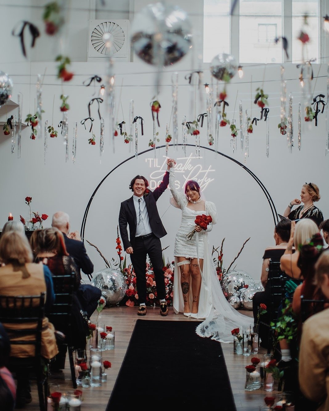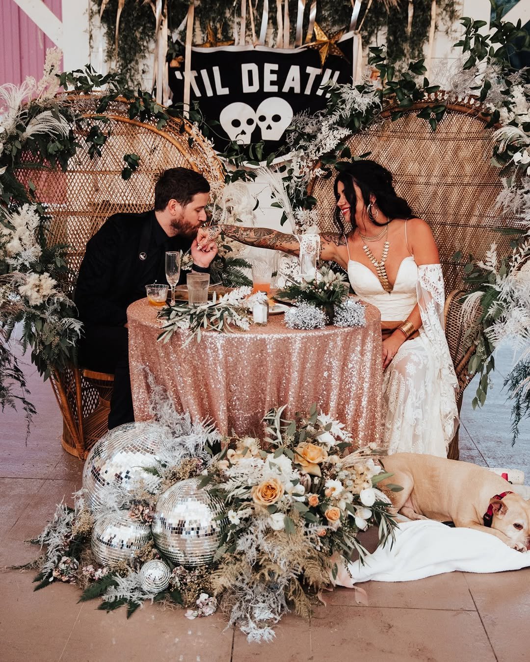 If Wednesday Addams hosted a wedding with David Bowie, this would be it. Between the floating disco balls, upside-down roses, and sleek black accents, this ceremony is giving alternative love with maximum flair.
