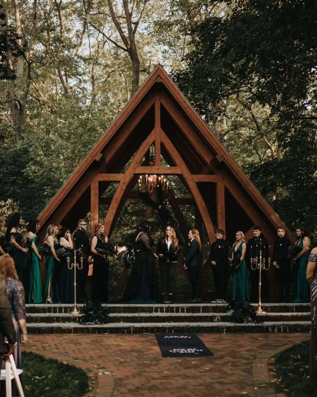Tucked in the woods beneath a soaring timber frame, this ceremony balances mystery with magic. The deep emerald dresses and black gothic florals read like a modern-day coven—elegant, not costumey. And can we talk about that golden chandelier glowing in the shadows?