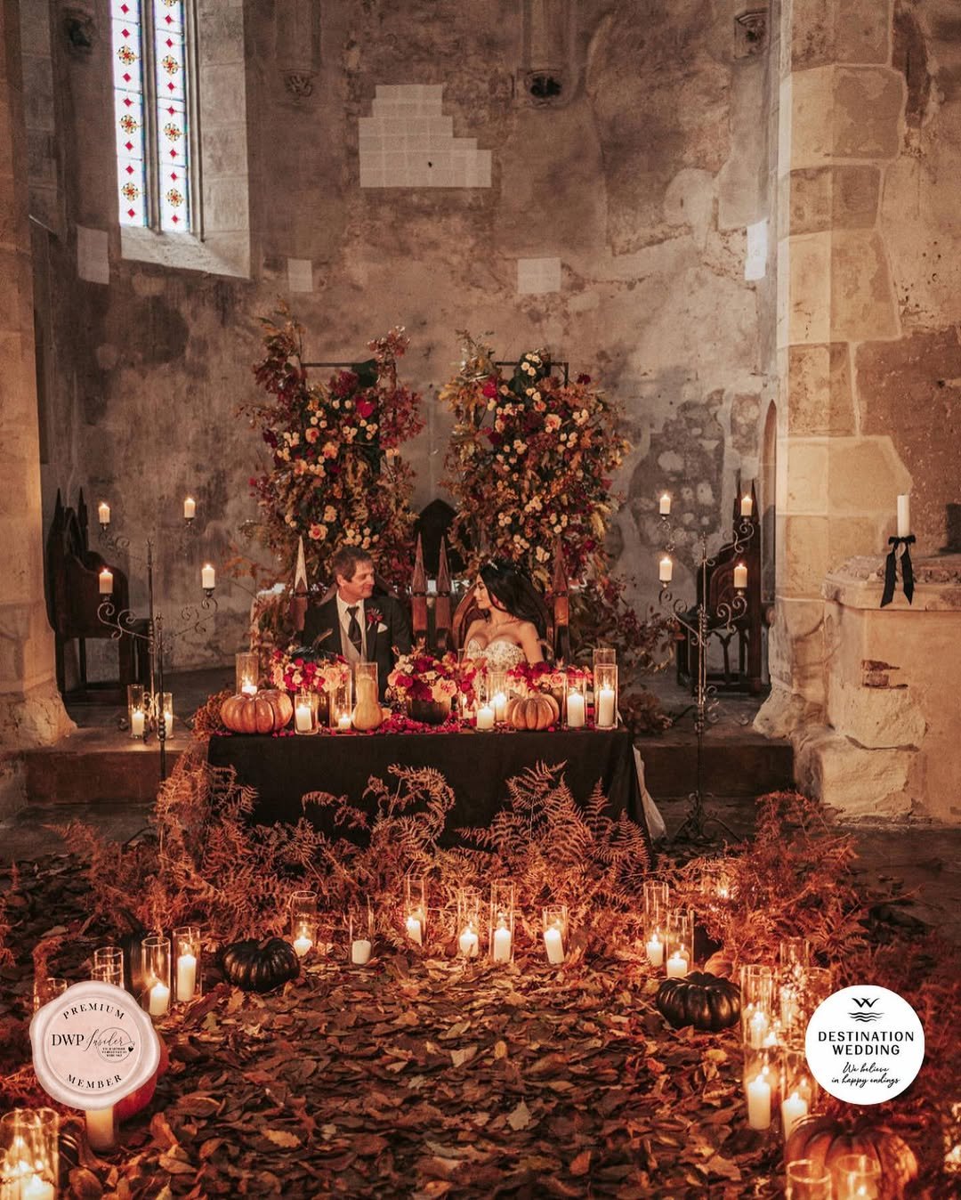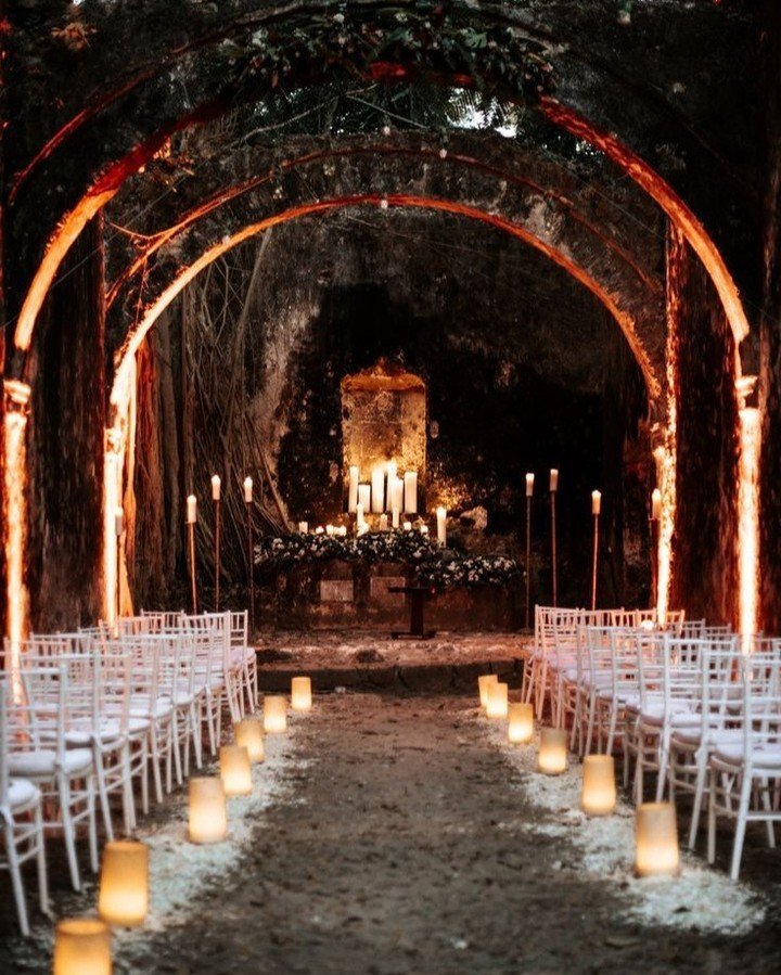 There’s something deliciously eerie about saying “I do” in a crumbling stone chapel lit only by candles. This ceremony feels like it was plucked straight from a gothic novel—the kind where love is eternal, but also a little cursed.