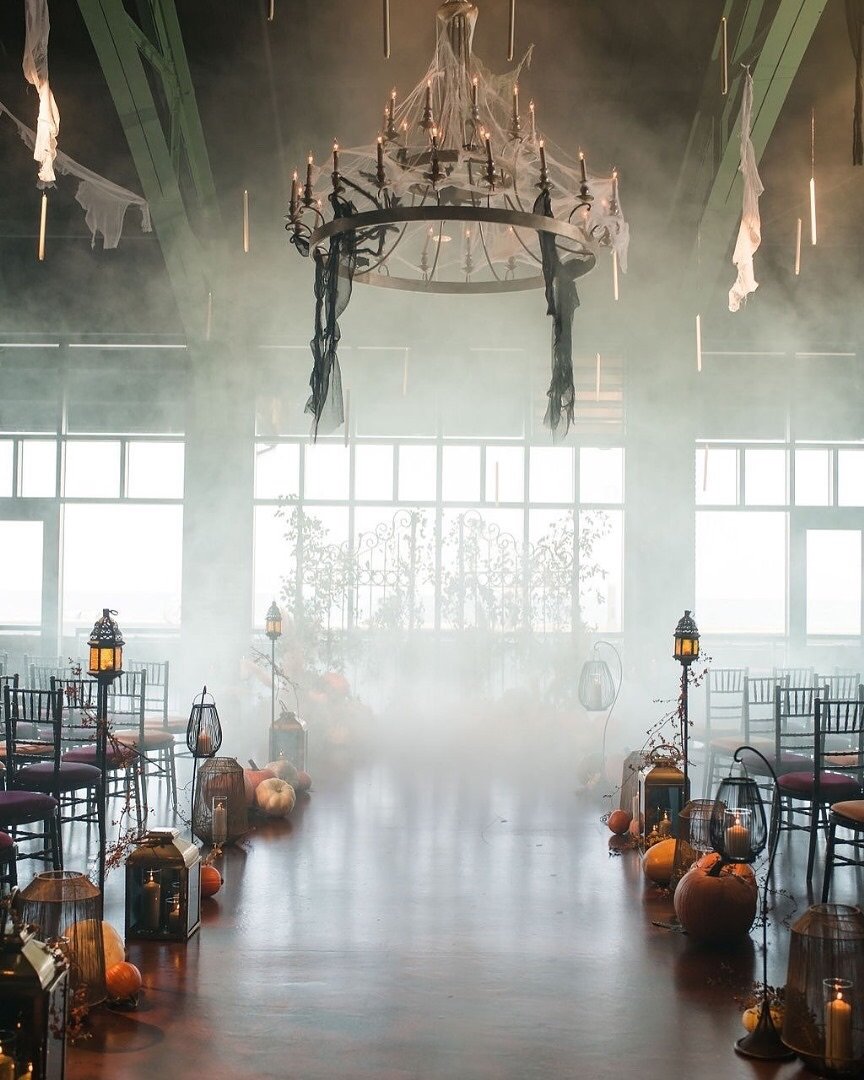 This fog-filled fantasy is giving major Tim Burton energy—but refined. With pumpkins tucked into wrought-iron lanterns, floating chandeliers, and smoky mist curling through the aisle, it’s a visual feast of ghostly romance.