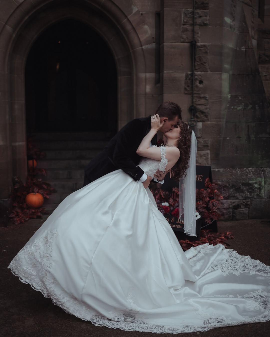 This kiss-in-the-mist moment is the stuff dark fairytales are made of. Outside a stone cathedral, the bride’s full satin gown with scalloped lace hem feels lush and hauntingly regal. Add in a groom in velvet, the subtle glimmer of pumpkins at their feet, and you’ve got a Tim Burton-style love story—only with more glam and way better lighting.