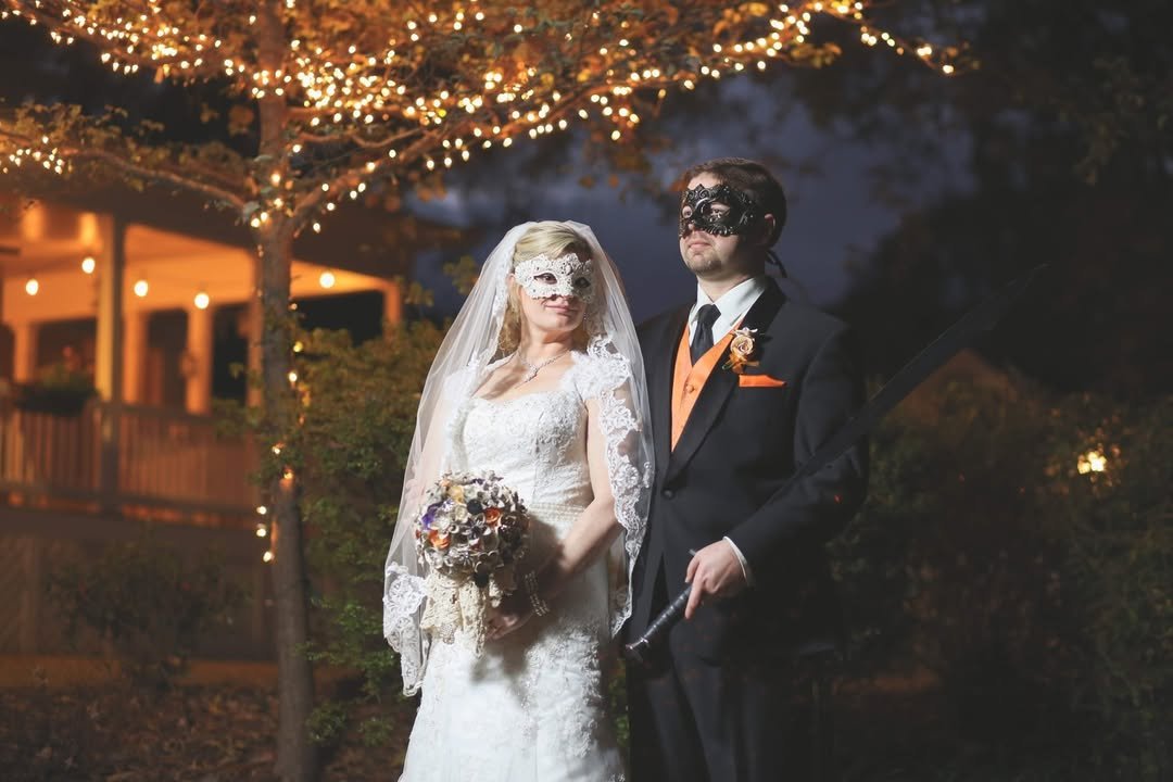 Masquerade weddings always carry a little mystery—and this one leans fully in with lace masks, orange silk accents, and a touch of drama. The bride’s vintage-style veil and bouquet of dried blooms make it feel both timeless and theatrical.
