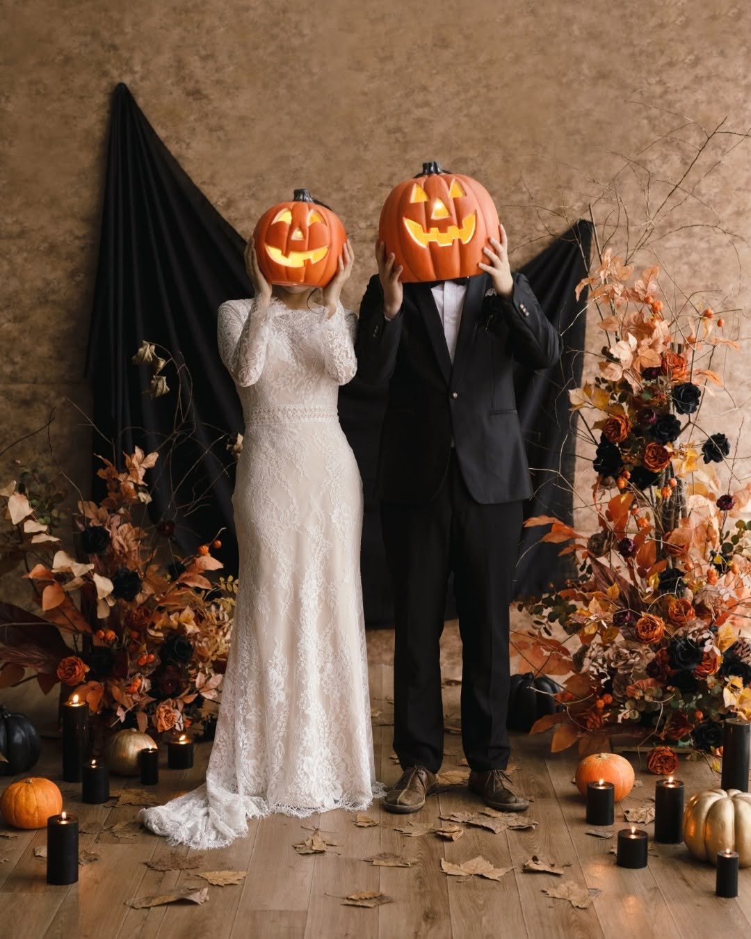 This one is for the couples who’d happily swap classic romance for cult Halloween camp—and somehow still make it chic. The headless newlyweds with glowing jack-o’-lanterns in place of faces are bold, bizarre, and a little bit brilliant. It’s editorial meets October, and we’re obsessed.