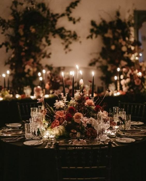 The candlelight. The black taper glow. The moody florals that seem to spill and sprawl in all the right places. This tablescape is pure magic—a dinner party that whispers of midnight rituals and rich red wine.