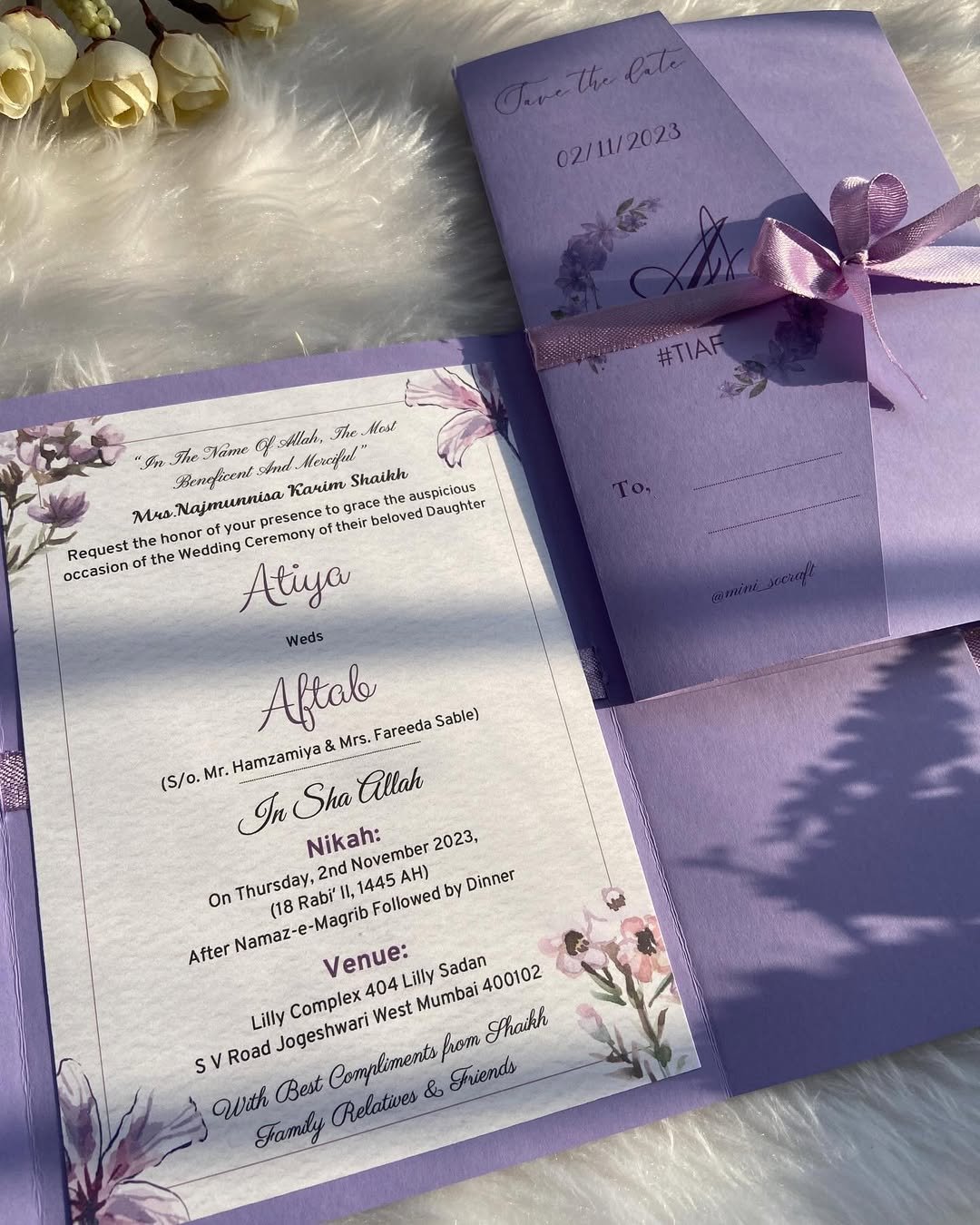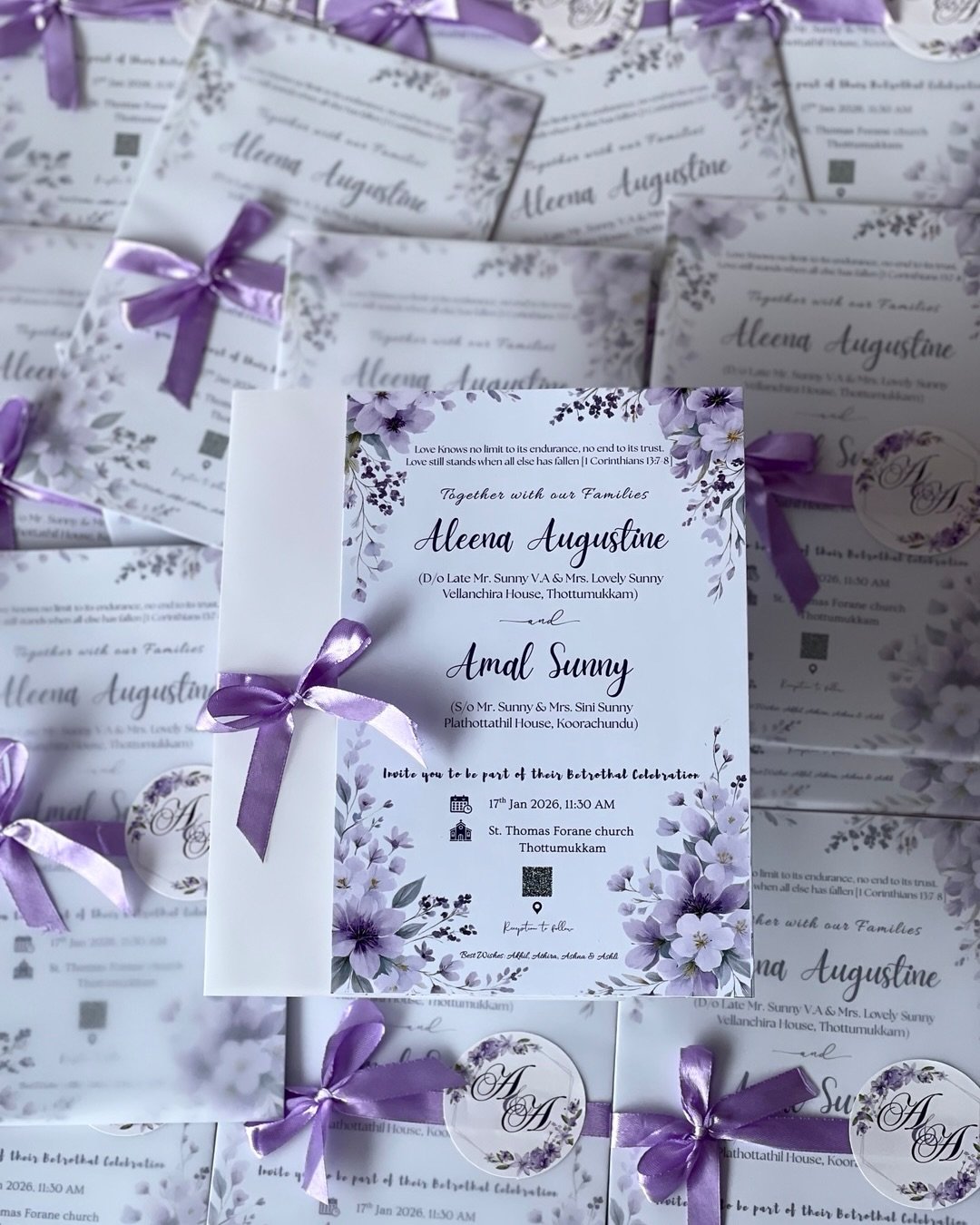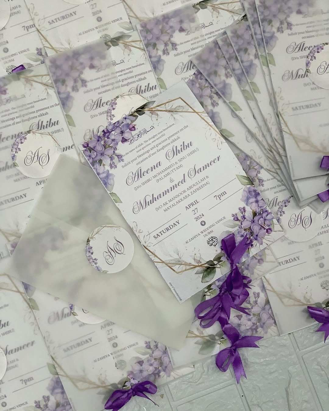 The vibrant purple bows add an energetic flourish, ideal for a spring or evening garden ceremony. These are invites that won’t just be opened—they’ll be admired and kept.