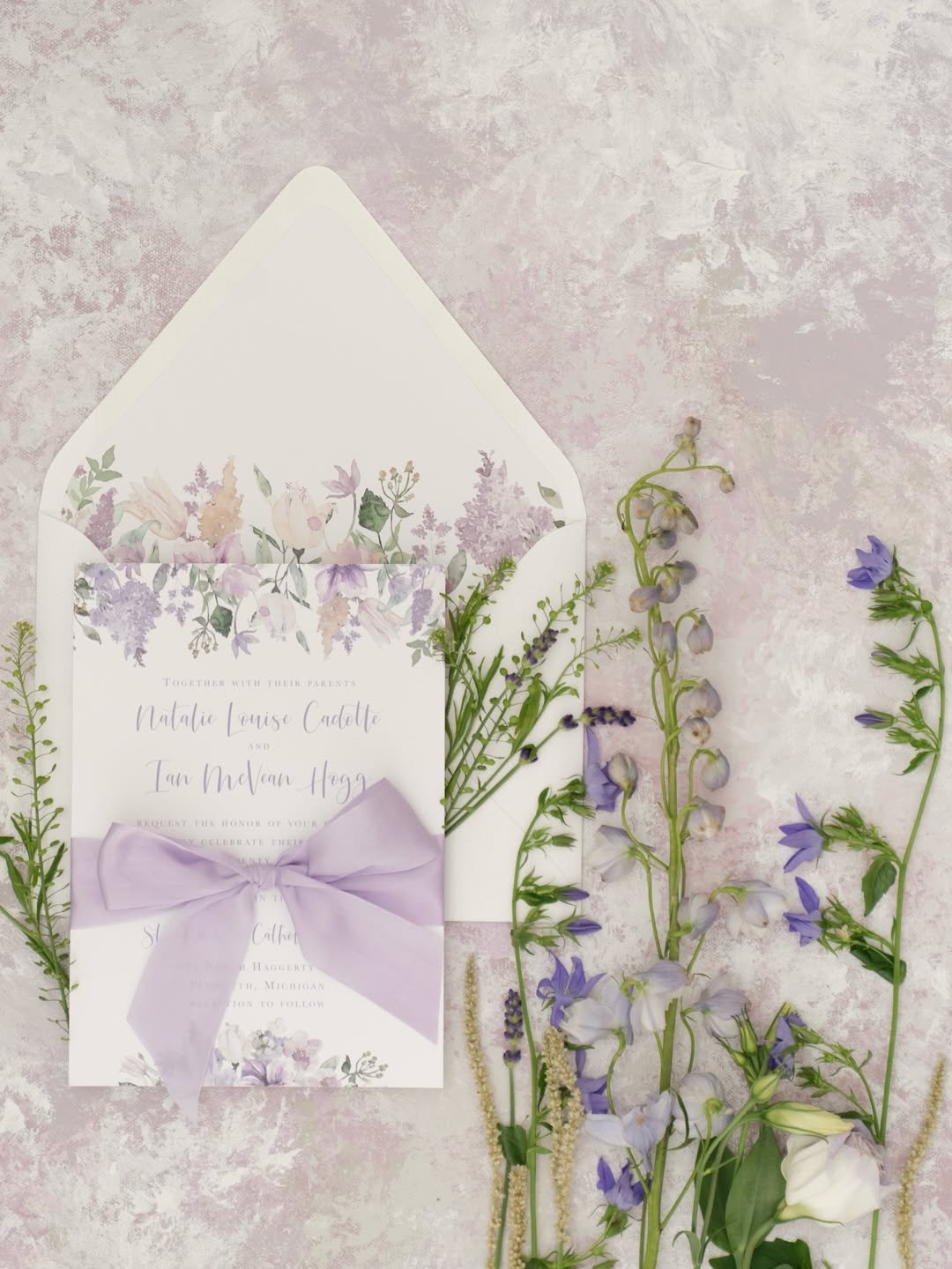 Few things say romantic quite like a wide lavender bow, and @daisylanesd’s design leans all the way in. With pastel watercolor florals blooming from the envelope liner and framing the card, this suite balances sweetness with sophistication.