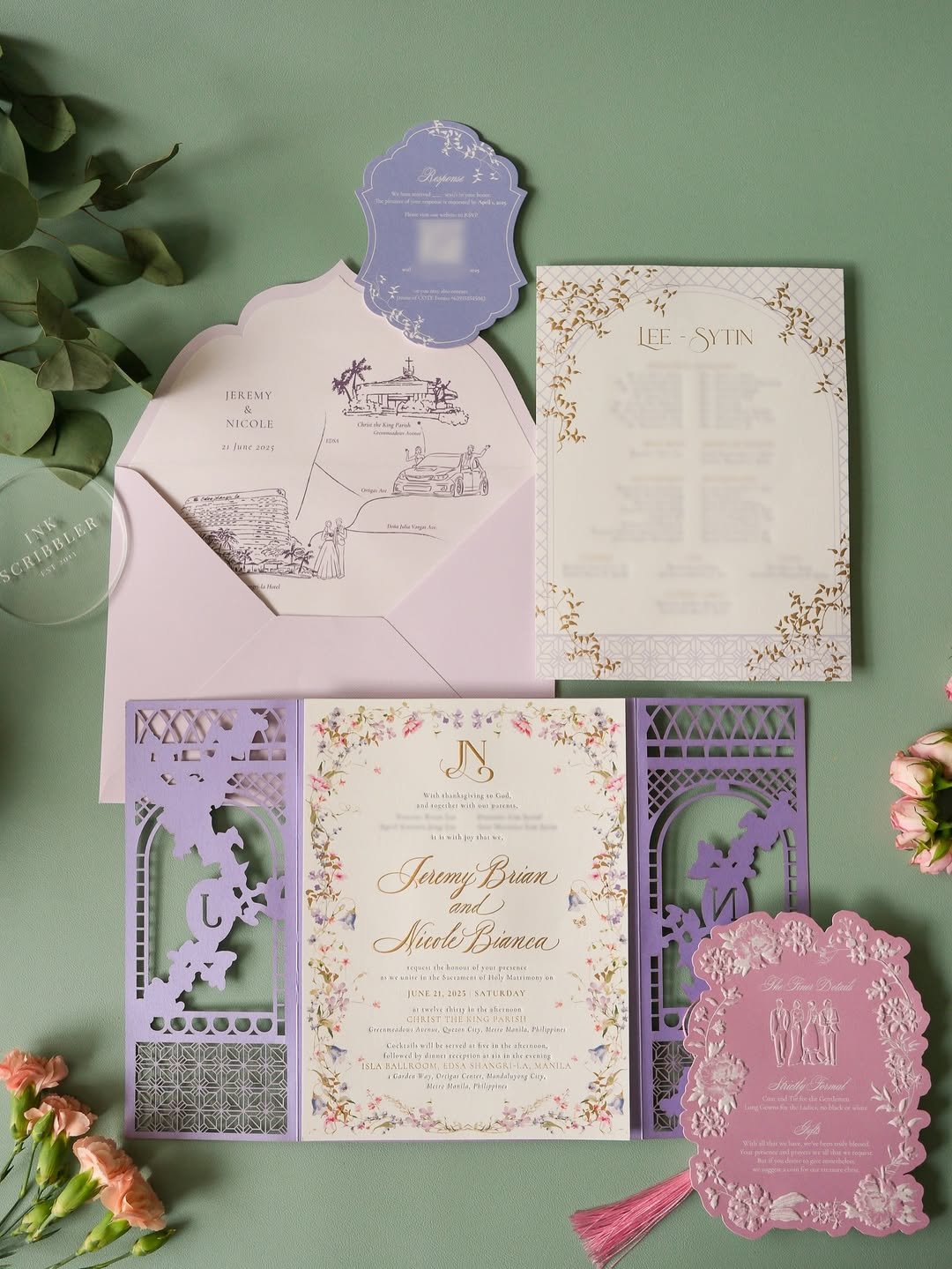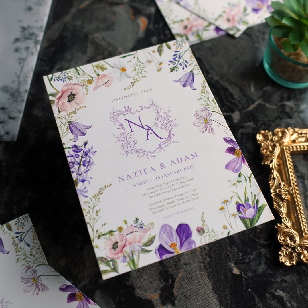 Understated and refined, this suite by @delicatedreamslk opts for lavender-toned sketches instead of blooms, giving it a clean, minimalist edge. The trimmed edges and structured format give it a polished finish, but the lavender motif softens it just enough to keep it romantic.