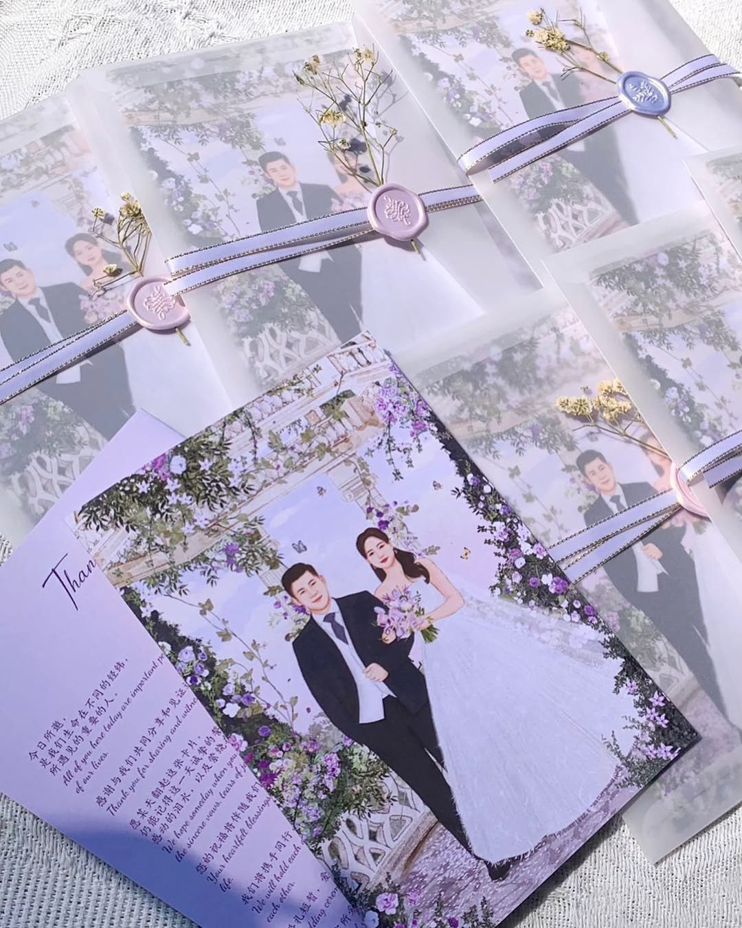 There’s something irresistibly charming about custom-illustrated wedding invites, and @alicescape_ captures that magic perfectly. The hand-drawn couple set in a whimsical lavender garden feels like a page from a modern fairytale. Each invitation is wrapped in translucent vellum, tied with lilac ribbon and sealed with a wax stamp, giving it that heirloom feel—like a love letter passed down through generations.
