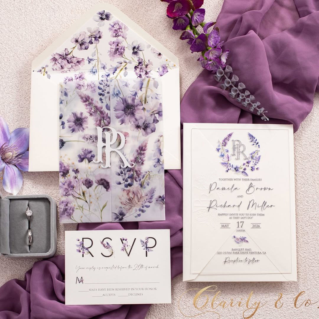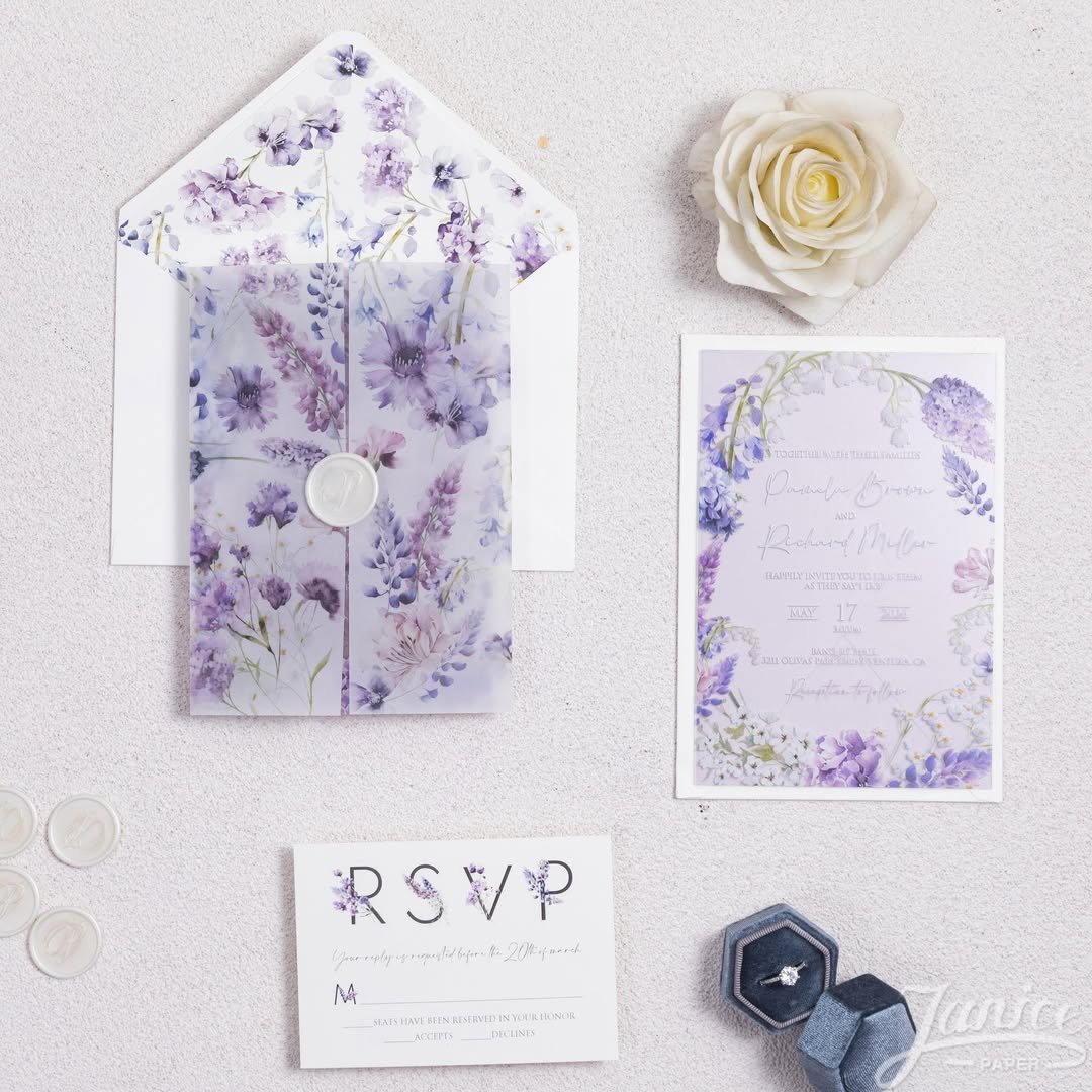 Softly romantic with a hint of whimsy, these 23 lavender wedding invitation ideas feel like a love letter wrapped in color. Expect gentle hues, elegant details, and a dreamy charm that sets a beautifully serene tone for your celebration.