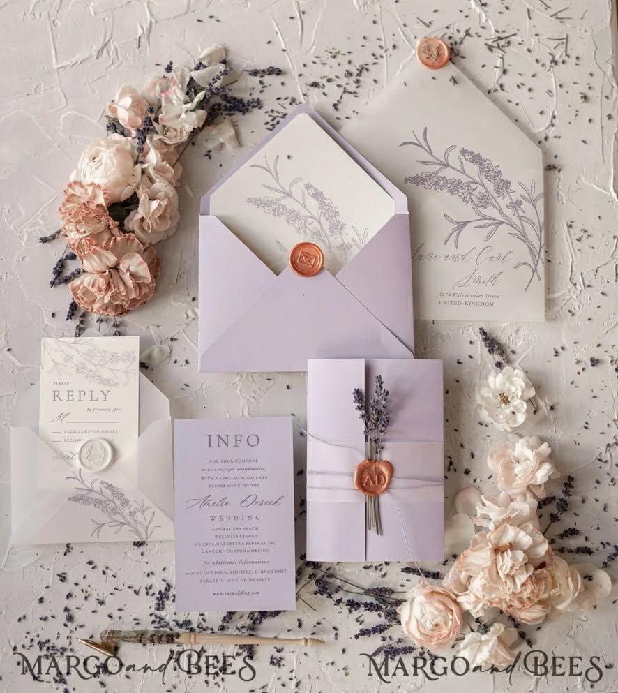 The lavenders sprinkled throughout—both in color and illustration—tie everything together in a gentle, cohesive palette. And that wax seal on the envelope? A subtle nod to tradition in an otherwise contemporary set. It’s perfect for the couple who wants something fresh but still rooted in elegance.