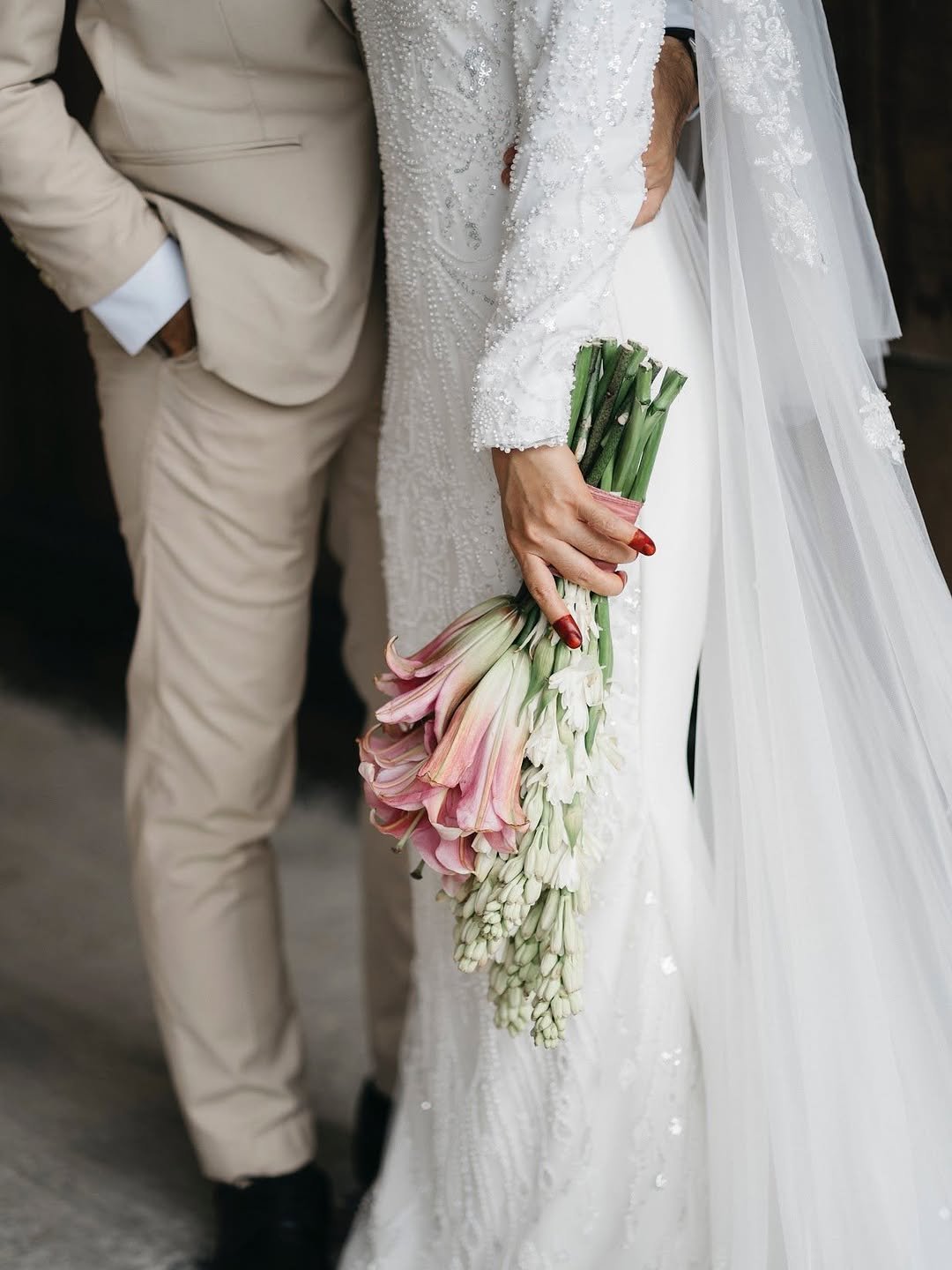 Pure elegance with a side of modern minimalism—this bouquet is everything. The creamy calla lilies are sculptural and sleek, standing tall against the bride’s dreamy, detailed gown. There’s something about how the soft curves of the flowers echo the lines of her dress that makes it feel perfectly intentional.