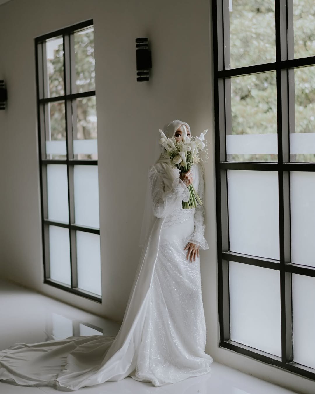 Soft light spilling through tall windows, a trailing gown, and a bouquet that’s equal parts romance and freshness—this is a scene straight out of a bridal editorial. The mix of calla lilies and delicate fillers adds depth without stealing focus from the bride’s graceful silhouette.