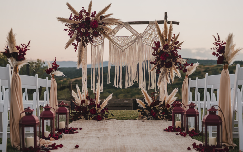 A handcrafted macramé backdrop sways gently in the evening breeze, draped over a rustic wooden arch adorned with dramatic bursts of dried pampas grass and deep burgundy florals. The aisle, lined with vintage crimson lanterns and scattered petals, leads to a moment of quiet intimacy, where vows will be spoken against the vast, open landscape.