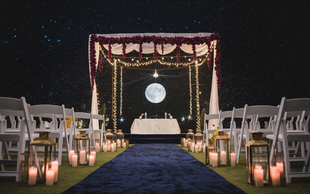 A midnight-blue aisle leads toward a beautifully adorned canopy, its delicate white drapery laced with deep burgundy florals. Twinkling string lights hang like constellations, framing the luminous full moon in the distance—a breathtaking centerpiece that seems to shine just for this moment. Rows of golden lanterns, their flickering candles casting warm reflections, line the path, guiding the way to forever.