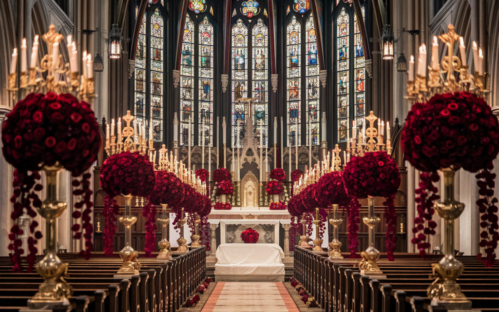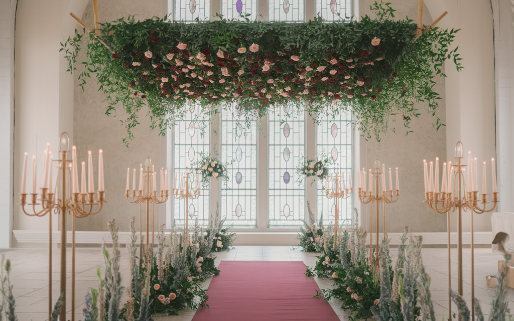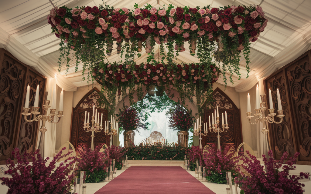A rich burgundy aisle unfolds like a royal path, leading to an altar framed by intricately carved wooden panels and soft ivory drapery. Overhead, a breathtaking floral chandelier of blush and deep crimson roses hangs in suspended splendor, its delicate vines spilling downward like a secret garden in the sky. Towering candelabras line the aisle, their flickering flames casting a warm, golden glow over the intricate floral arrangements that burst with wild beauty.