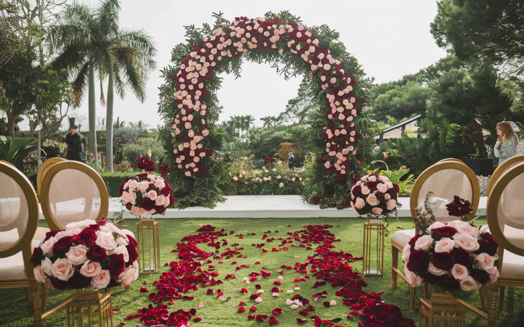 A floral arch, adorned with blush and deep crimson roses, stands as a breathtaking focal point, framing the vows with the delicate artistry of nature. Beneath it, a pathway of scattered petals leads to forever, each step softened by the scent of fresh blooms. Gold-framed chairs with plush ivory seating add a regal contrast to the surrounding greenery, elevating the ambiance while remaining effortlessly in tune with the landscape.