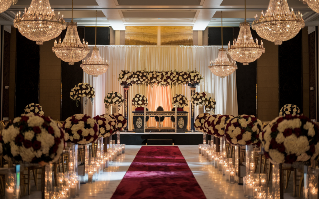 Towering floral arrangements of velvety crimson and soft ivory roses stand as luxurious sentinels, their rich hues complementing the regal setting. Crystal chandeliers, glistening like suspended constellations, bathe the room in a soft golden glow, enhancing the drama of the deep, jewel-toned palette. Rows of gold Chiavari chairs align in perfect symmetry, inviting guests to witness a love story unfold amidst this breathtaking splendor.