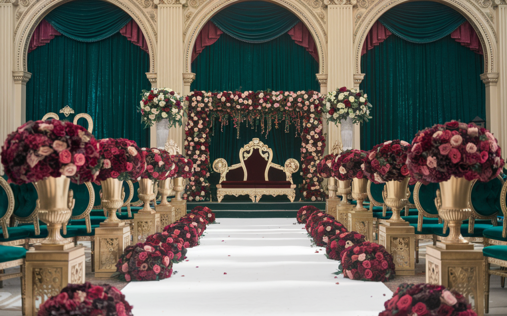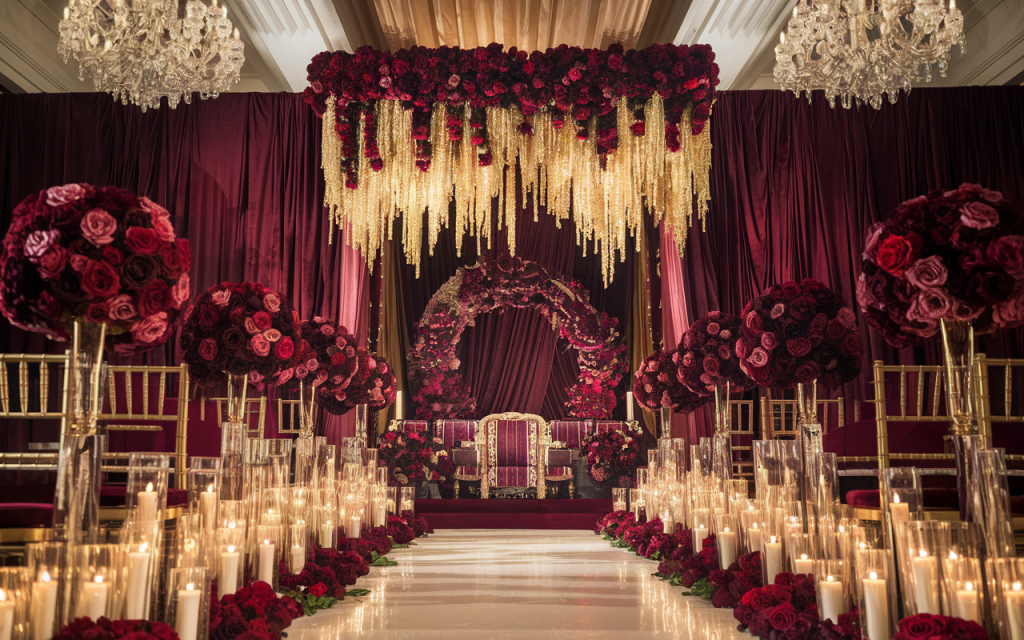 Towering arrangements of velvety roses in crimson and merlot flank the aisle, their intoxicating fragrance mingling with the soft flicker of candlelight. Golden chandeliers glisten above, casting a warm, ethereal glow, while cascading golden strands drip from the floral canopy, evoking the grandeur of a royal palace. The plush, jewel-toned seating and ornate gilded chairs whisper of regal sophistication, a throne fit for a love that deserves nothing less than majesty.