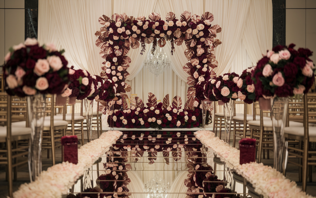 A sea of lush burgundy and blush roses envelops the arch, interwoven with metallic-toned leaves that shimmer under the glow of an ethereal chandelier. The mirrored aisle reflects the floral splendor, doubling the magic and creating a mesmerizing illusion of infinite beauty. Each step down this path feels like walking on a cloud of petals, guided by the soft flicker of candlelight.