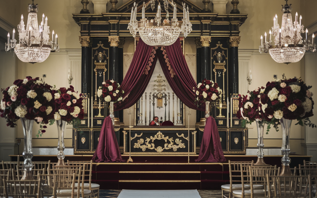 A pristine white aisle, delicately edged with crimson rose petals, leads to a lush floral archway entwined with ivy and deep-hued blooms. The soft flicker of candlelight reflects against gilded candelabras, casting an intimate golden glow upon the stately chairs adorned in rich burgundy velvet. Every element is meticulously placed to evoke the grandeur of an era where romance was an art form, and love was celebrated with unmatched splendor.