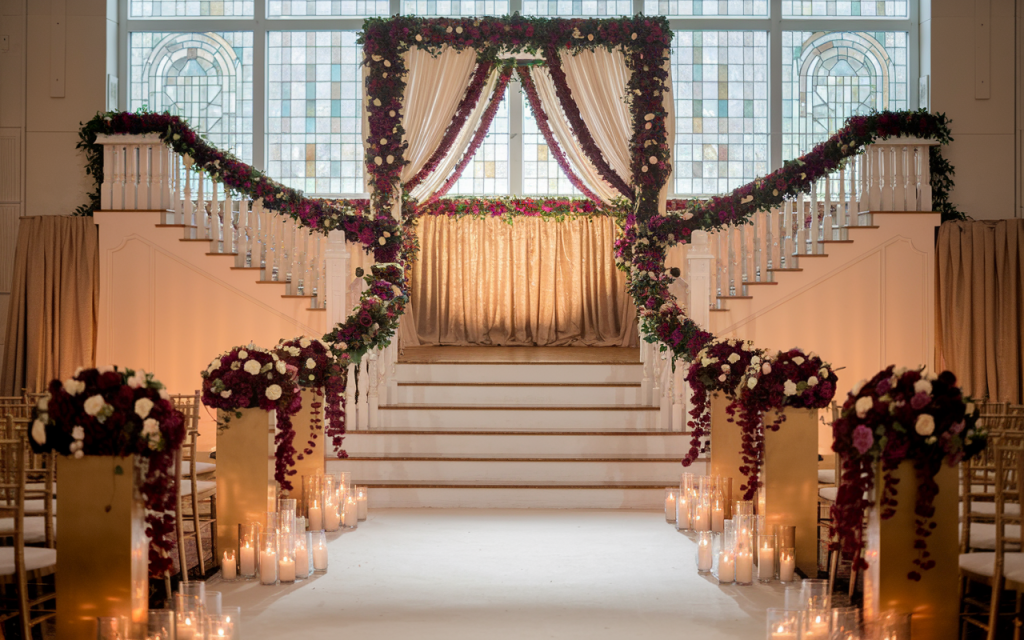 Rich cascades of burgundy and ivory florals weave through the elegant white railings, drawing the eye toward the magnificent altar at the top of the steps. Luxurious gold accents glisten beneath the warm glow of flickering candlelight, lining the aisle in a symphony of reflection and depth. The stained-glass windows filter daylight in the softest hues, adding an almost celestial aura to the space.