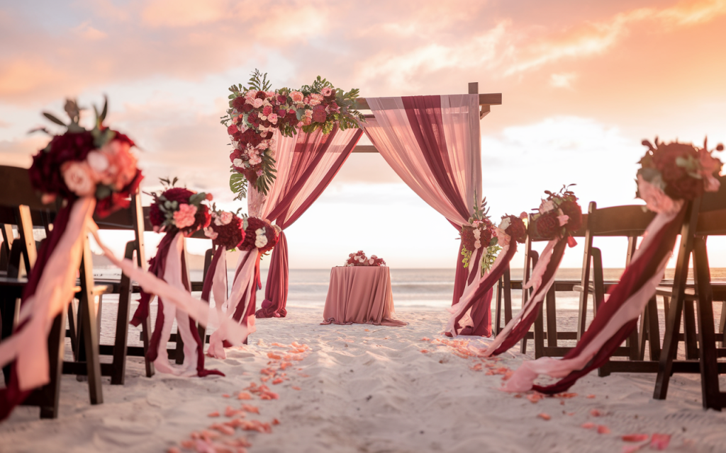 The Sunset Serenade wedding ceremony is a vision of romance, where the golden hues of the setting sun melt into the soft blush and deep burgundy tones of the décor. The gentle waves whisper in the distance, creating a symphony of nature that harmonizes with the tender vows to be exchanged.
