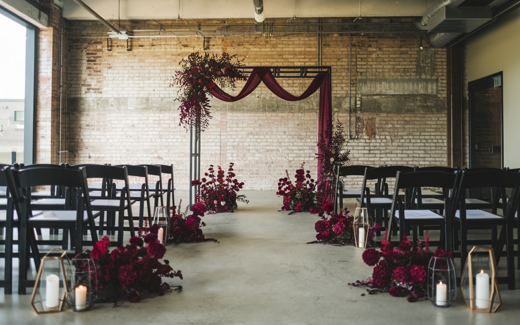 The Urban Elegance wedding ceremony redefines romance with an edgy, industrial-chic aesthetic. Set against a backdrop of exposed brick and raw concrete, this space blends the warmth of candlelight with the depth of deep burgundy florals, creating an atmosphere of moody sophistication.
