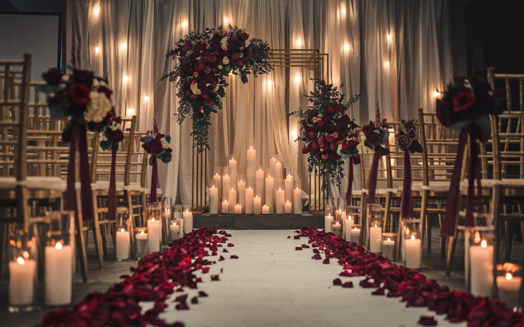A rich crimson aisle runs like a royal carpet, leading to an altar framed in an exquisite floral canopy of ivory and deep merlot blooms. Grand floral spheres, perched atop sleek glass pedestals, line the walkway, their soft petals illuminated by a sea of flickering candles that cast a golden shimmer onto the polished marble floor.