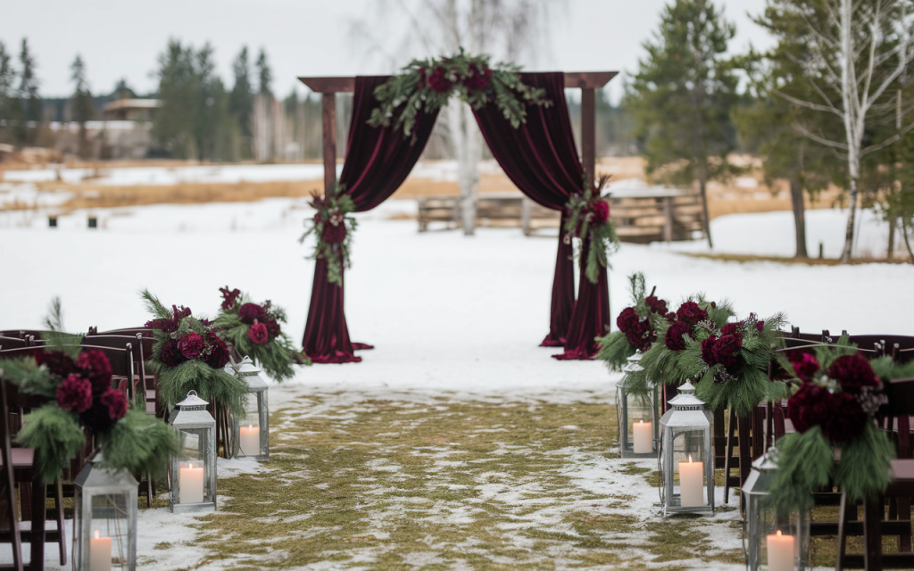 A wooden arch, draped in luxurious burgundy velvet, stands as the focal point, its deep, velvety hues contrasting beautifully against the pure white snow. Lush evergreen foliage and rich, wine-colored florals frame the altar, bringing warmth to the wintry expanse. The pathway leading to this moment of forever is lined with flickering candlelit lanterns, their glow dancing across the icy ground, casting an intimate and ethereal ambiance.