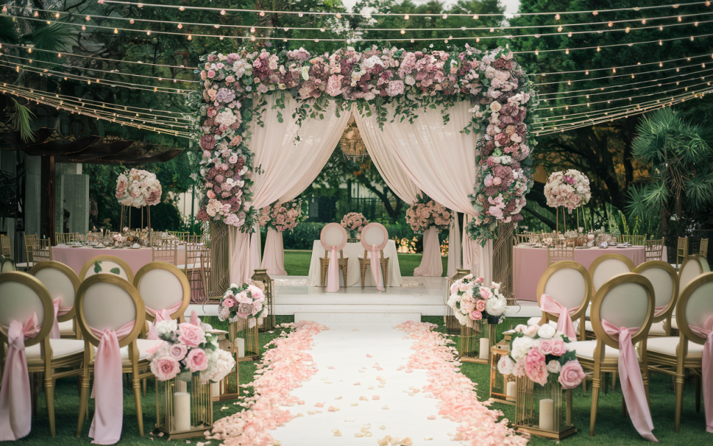 The tables are dressed in pastel perfection, adorned with tall floral centerpieces resting atop golden stands. Elegant gold-rimmed chairs, tied with soft pink sashes, invite guests to a feast set under a canopy of twinkling string lights. The air is filled with the scent of fresh blooms, the laughter of loved ones, and the magic of a love story unfolding in the most enchanting way.