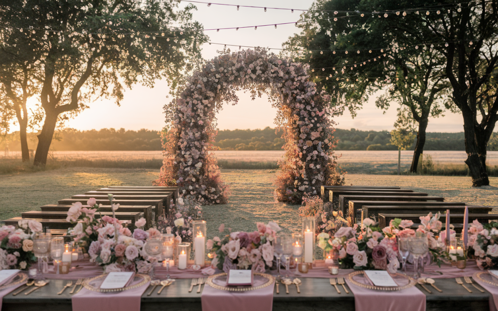 Rustic wooden benches lead to the altar, where the interplay of candlelight and dusk creates an ethereal glow. The reception table, draped in blush linens, overflows with floral arrangements in hues of soft pink, mauve, and lavender, echoing the tender embrace of twilight. Gilded place settings, vintage crystal glassware, and flickering candles add an air of refined elegance, balancing rustic charm with timeless sophistication.