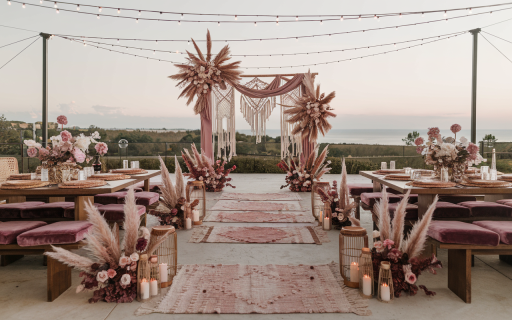 The Boho Blush wedding setting is a mesmerizing fusion of free-spirited elegance and earthy romance. Perched on a sun-kissed terrace overlooking the sea, this ethereal scene unfolds as the sky melts into soft pink and lavender hues. The air is light, the atmosphere intimate—where nature’s beauty and bohemian artistry entwine in perfect harmony.