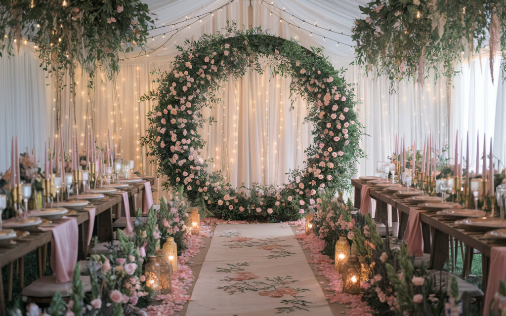 A floral-lined aisle, rich with soft pink petals, leads to a breathtaking circular arch—a symbol of eternity—woven with lush greenery and dainty blush roses. Behind it, warm fairy lights dance like fireflies against billowing ivory drapery, casting a golden glow over the intimate scene. Long wooden banquet tables, draped in flowing blush linens, are set with candlelit lanterns, crystal glassware, and gilded flatware, creating an ambiance both regal and inviting.