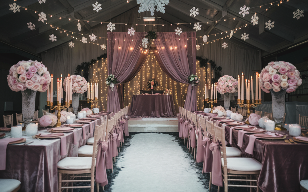 A dreamy aisle dusted with faux snow leads to a grand sweetheart table, framed by cascading mauve drapes and a backdrop of golden fairy lights. Suspended snowflakes twinkle above, reflecting the gentle glow of flickering candlelight. Tall crystal vases overflowing with blush roses and frosted greenery add a touch of romance to the wintery setting.