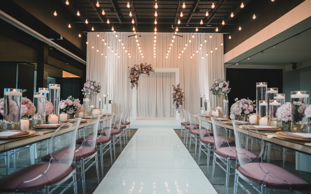 Sleek glass dining tables are lined with transparent ghost chairs, blending seamlessly into the modern aesthetic. Towering floral arrangements, accented with cascading crystal strands, add an element of grandeur, while warm candlelight flickers in elegant glass vases, casting a soft glow over the evening’s festivities.