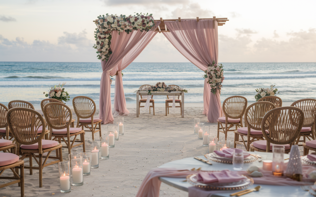 A pathway lined with flickering candlelit lanterns leads to the altar, where sheer blush drapery billows gently in the salty breeze, framing an intimate exchange of vows. Elegant floral arrangements of soft ivory and blush roses, mingled with lush greenery, enhance the romantic aesthetic, while natural rattan chairs add an organic touch to the beachfront ambiance.